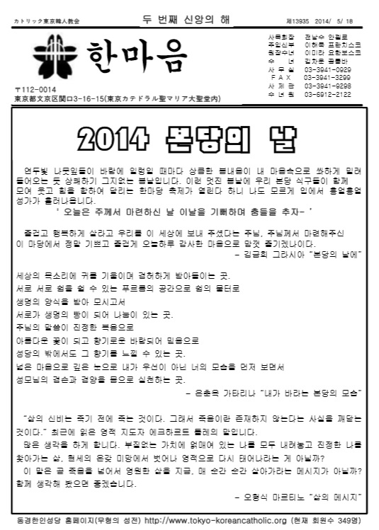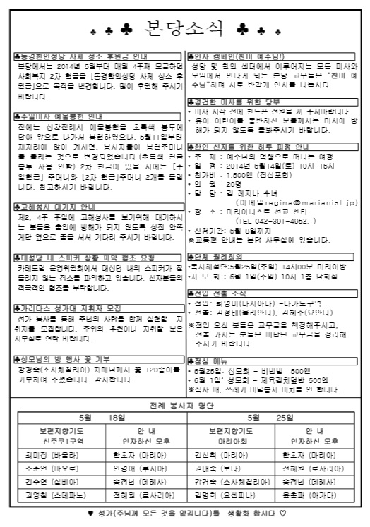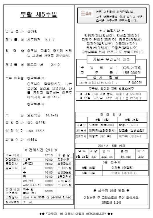 2014年 5月 18日 週報 페이지 정보 작성자 고마영마리아 작성일14-05-17 17:15 조회15,919회 이전글 다음글 목록 본문 2014年 5月 18日 週報 이전글 다음글 목록