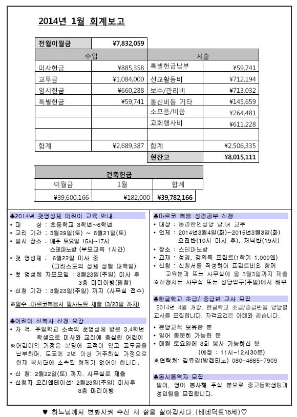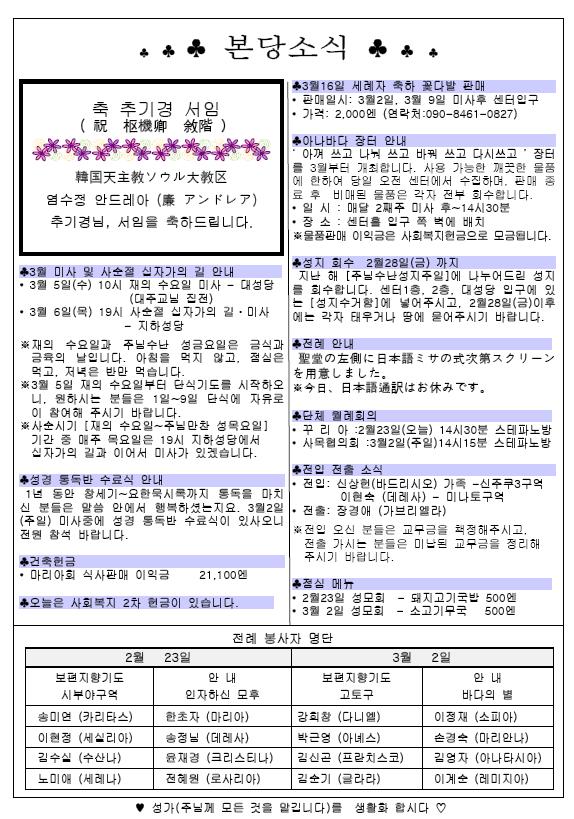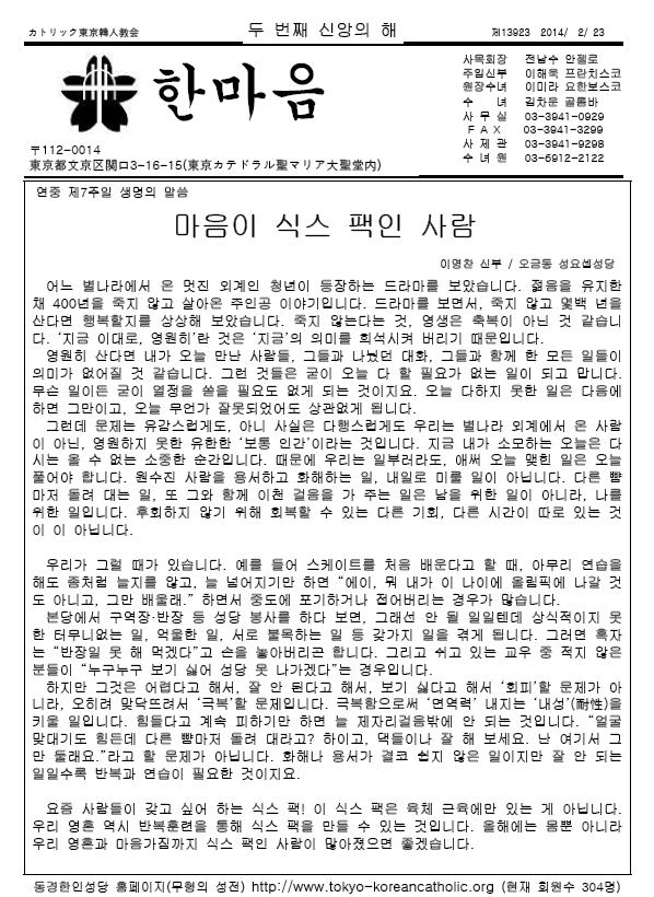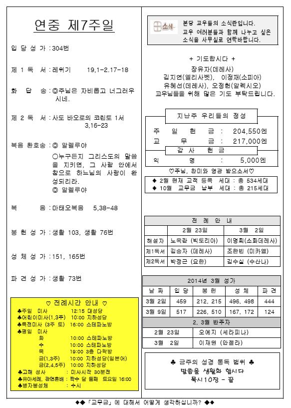 2014年 2月 23日 週報 페이지 정보 작성자 고마영마리아 작성일14-02-23 17:14 조회15,359회 이전글 다음글 목록 본문 2014年 2月 23日 週報 이전글 다음글 목록