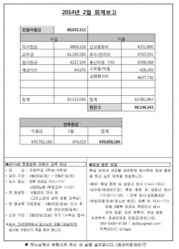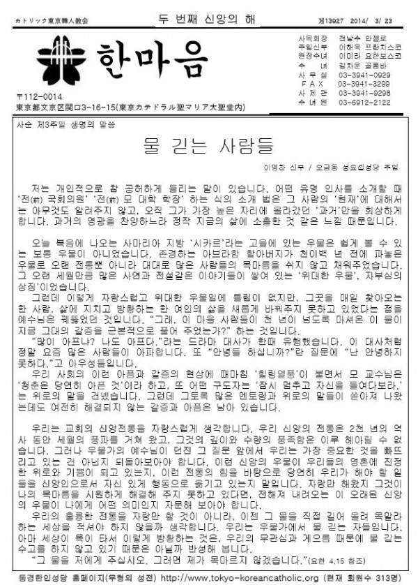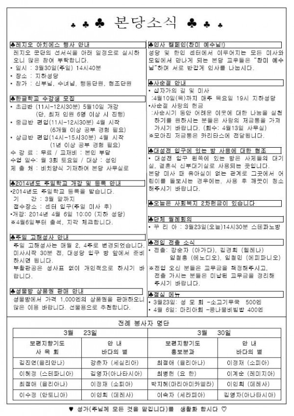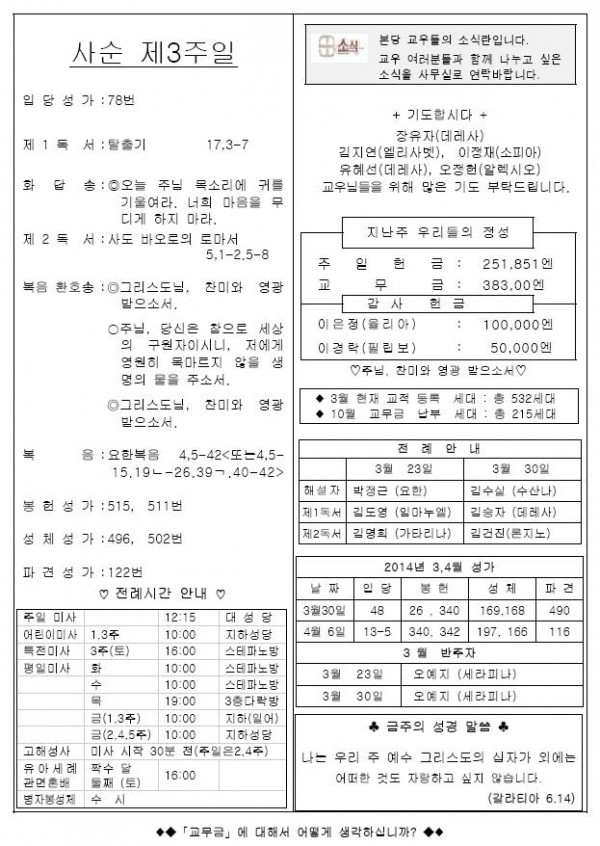 2014年 3月 23日 週報 페이지 정보 작성자 고마영마리아 작성일14-03-23 16:50 조회15,451회 이전글 다음글 목록 본문 2014年 3月 23日 週報 이전글 다음글 목록