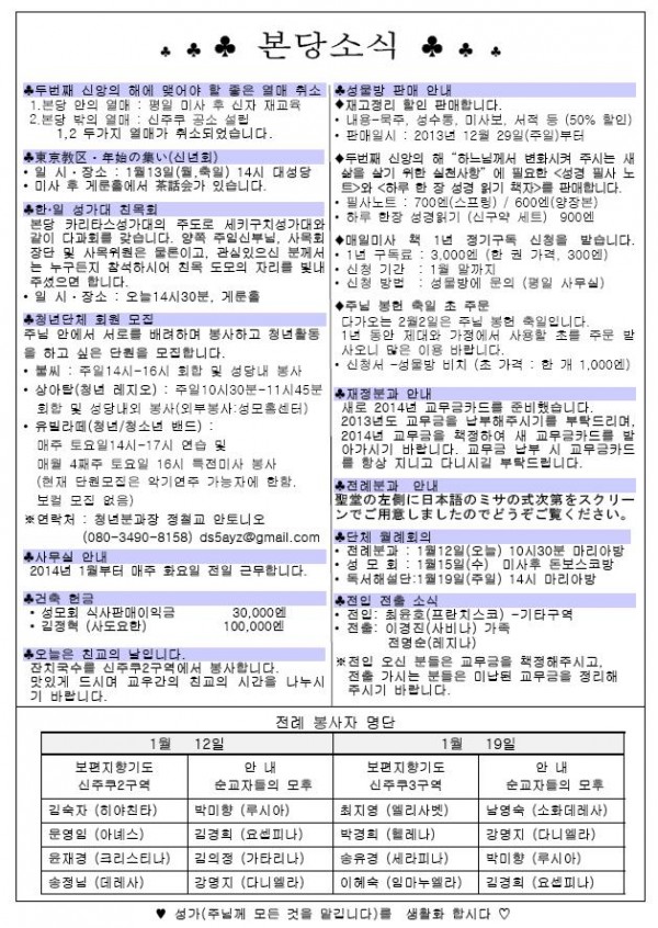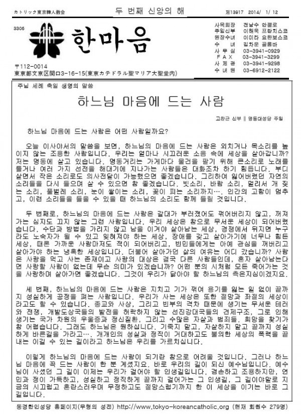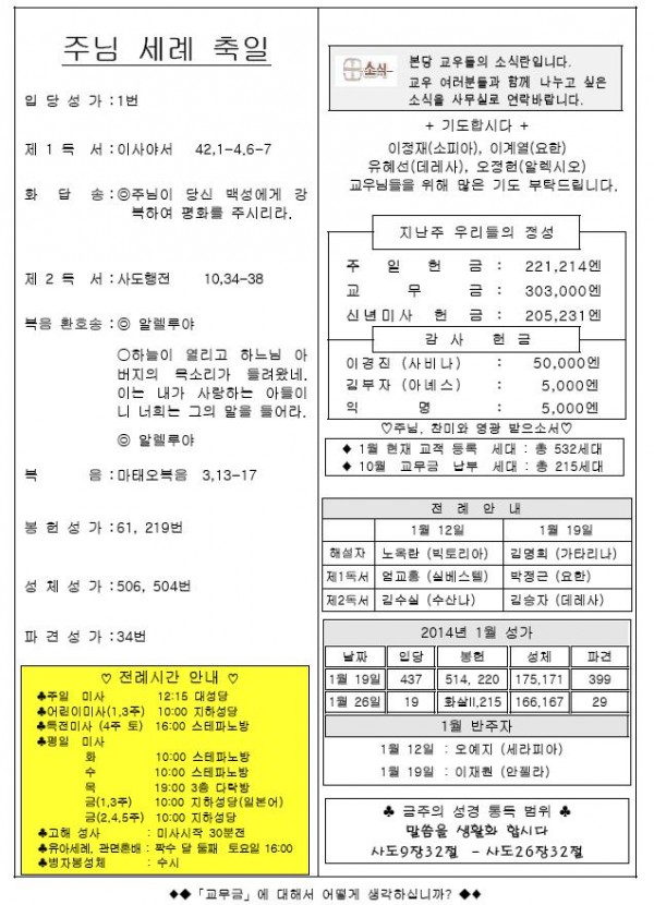 2014年 1月 12日 週報 페이지 정보 작성자 고마영마리아 작성일14-01-12 16:31 조회16,242회 이전글 다음글 목록 본문 2014年 1月 12日 週報 이전글 다음글 목록